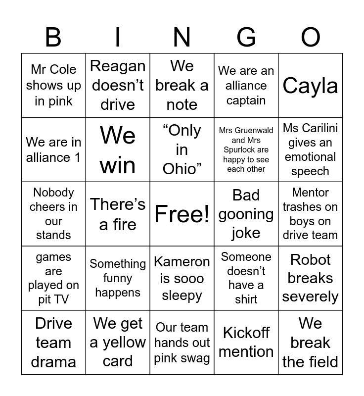 This bingo card has a free space and 24 words: Something funny happens, We get a yellow card, “Only in Ohio”, Drive team drama, Cayla, Mr Cole shows up in pink, We are in alliance 1, Reagan doesn’t drive, Bad gooning joke, Kameron is sooo sleepy, Mrs Gruenwald and Mrs Spurlock are happy to see each other, Nobody cheers in our stands, Someone doesn’t have a shirt, Robot breaks severely, We win, Kickoff mention, Mentor trashes on boys on drive team, We break a note, Ms Carilini gives an emotional speech, There’s a fire, We break the field, games are played on pit TV, We are an alliance captain and Our team hands out pink swag.