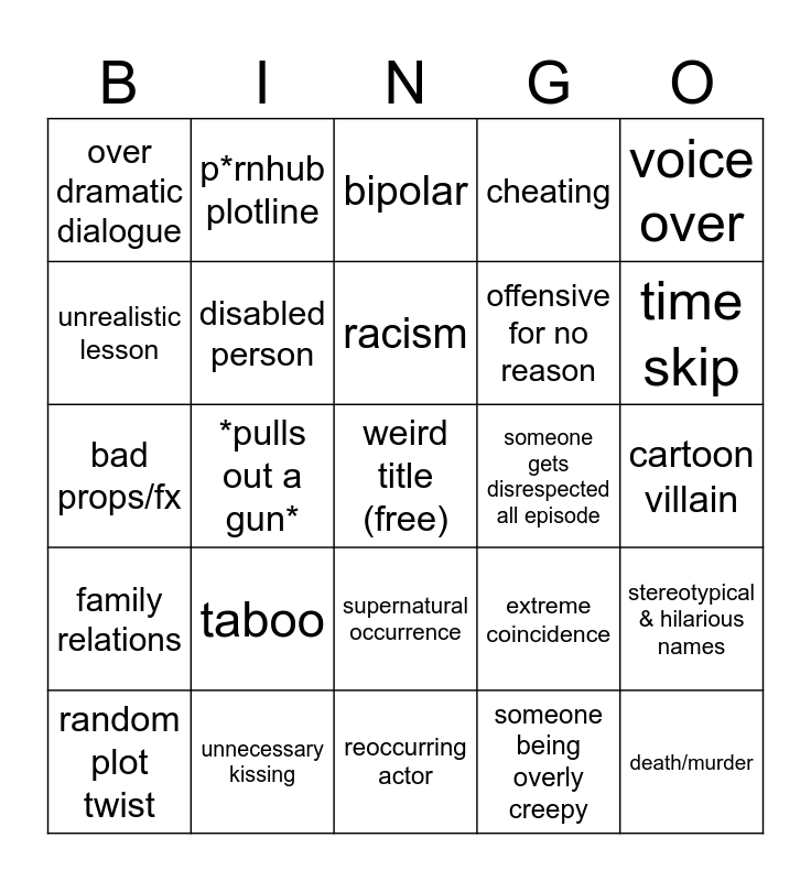 This bingo card has a free space and 24 words: taboo, unnecessary kissing, racism, random plot twist, voice over, over dramatic dialogue, unrealistic lesson, p*rnhub plotline, someone gets disrespected all episode, supernatural occurrence, offensive for no reason, bad props/fx, extreme coincidence, stereotypical & hilarious names, disabled person, someone being overly creepy, cartoon villain, bipolar, time skip, *pulls out a gun*, death/murder, family relations, cheating and reoccurring actor.
