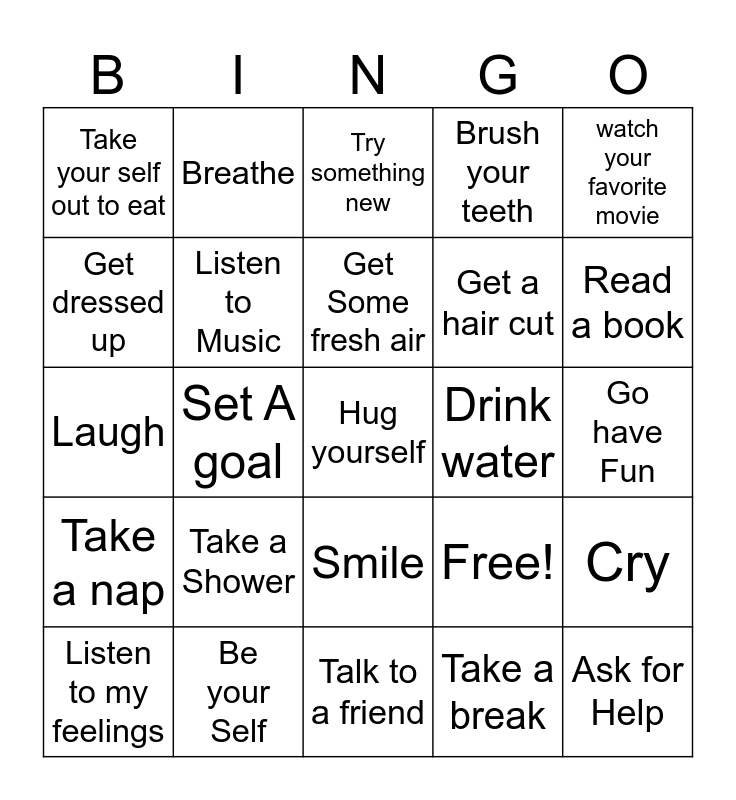 This bingo card has 25 words: Take a Shower, Talk to a friend, Get Some fresh air, Listen to my feelings, watch your favorite movie, Take your self out to eat, Get dressed up, Breathe, Drink water, Smile, Get a hair cut, Laugh, Free!, Cry, Listen to Music, Ask for Help, Go have Fun, Try something new, Read a book, Set A goal, Hug yourself, Be your Self, Take a nap, Brush your teeth and Take a break.