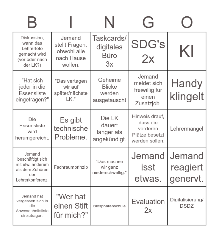 This bingo card has a free space and 24 words: Fachraumprinzip, "Wer hat einen Stift für mich?", Geheime Blicke werden ausgetauscht, Jemand hat vergessen sich in die Anwesenheitsliste einzutragen., KI, Diskussion, wann das Lehrerfoto gemacht wird (vor oder nach der LK?), "Hat sich jeder in die Essensliste eingetragen?", Jemand stellt Fragen, obwohl alle nach Hause wollen., Hinweis drauf, dass die vorderen Plätze besetzt werden sollen., "Das machen wir ganz niederschwellig.", Jemand meldet sich freiwillig für einen Zusatzjob., Die Essensliste wird herumgereicht., Jemand isst etwas., Jemand reagiert genervt., "Das vertagen wir auf später/nächste LK.", Evaluation 2x, Lehrermangel, Taskcards/ digitales Büro 3x, Handy klingelt, Es gibt technische Probleme., Digitalisierung/ DSDZ, Jemand beschäftigt sich mit etw. anderem als dem Zuhören der Lehrerkonferenz., SDG's 2x and Biosphärenschule.
