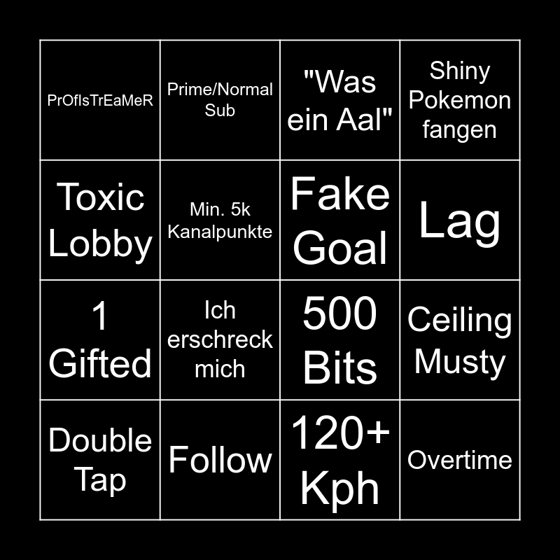This bingo card has 16 words: Follow, Ceiling Musty, "Was ein Aal", PrOfIsTrEaMeR, 1 Gifted, Prime/Normal Sub, 500 Bits, 120+ Kph, Toxic Lobby, Min. 5k Kanalpunkte, Double Tap, Shiny Pokemon fangen, Ich erschreck mich, Lag, Fake Goal and Overtime.