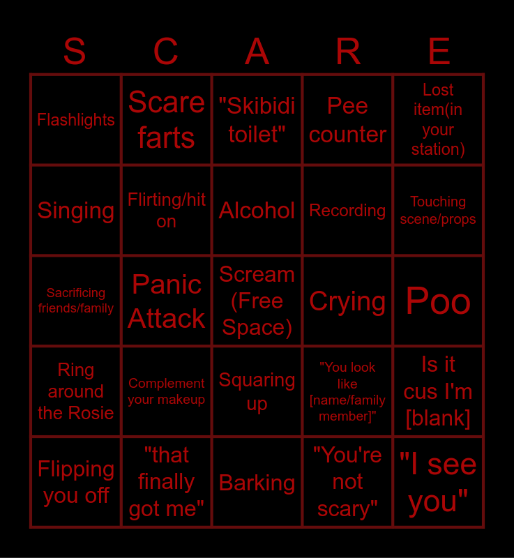 This bingo card has a free space and 47 words: Diddy, "I see you", "Is that person real?", Barking, Complement your makeup, Complement your outfit, Scare farts, "Dap me up bro", Singing, Try to scare you, Flirting/hit on, Pee counter, Is it cus I'm [blank], "You look like [name/family member]", "Can you do that to my ex", Weed, Alcohol, Crying, Make someone fall over, Lost item(in your station), Panic Attack, "You're not scary", Flashlights, Recording, "Can you scare [name]?", Touching scene/props, Flipping you off, Throwing hands, Squaring up, Ring around the Rosie, "Why is it always me?", Demand Fortinite/TikTok dance, Feeling God, Running off trail, Going the wrong way, "that finally got me", Poo, Asking for socials, "is it almost over?", Media clown reference, Begging, "Skibidi toilet", Sacrificing friends/family, Vomiting, Hiding from you, Vape and "You got it, you got it".
