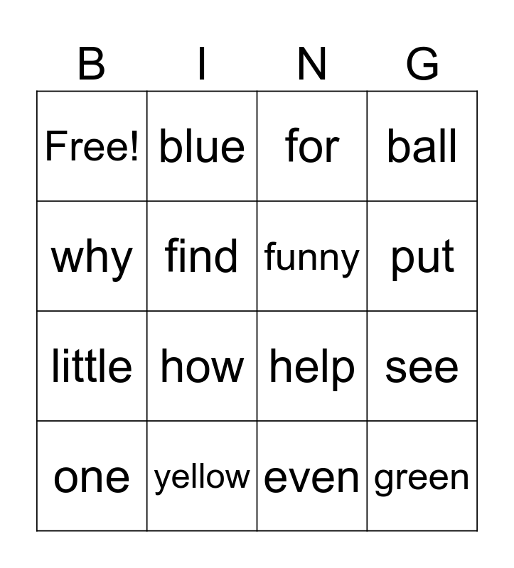 This bingo card has 16 words: one, yellow, for, ball, why, blue, help, see, Free!, find, even, put, little, how, funny and green.