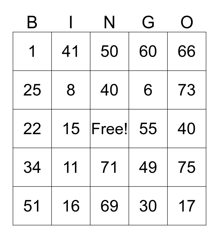 This bingo card has a free space and 24 words: 11, 16, 40, 51, 66, 1, 25, 41, 55, 71, 6, 22, 49, 75, 8, 30, 40, 50, 73, 15, 17, 34, 60 and 69.