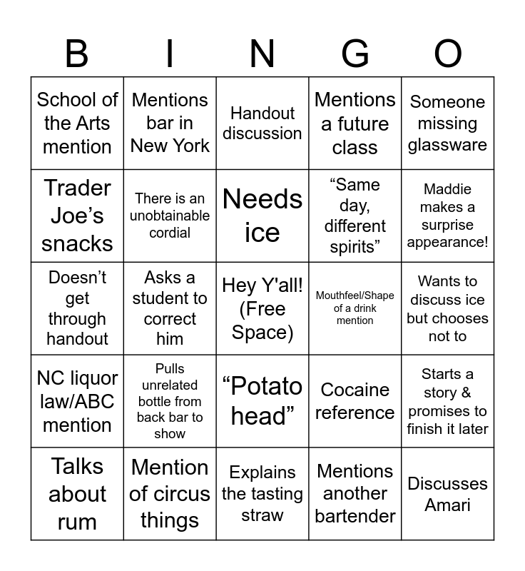 This bingo card has a free space and 37 words: Orange peel squeeze for essential oils, Leans against ladder/sits on ladder, Mentions split base, Brings up bitters, There is an unobtainable cordial, Starts a story & promises to finish it later, Pulls unrelated bottle from back bar to show, Needs ice, Wears floral apron, Someone missing glassware, Explains back shake, Asks a student to correct him, Mentions a future class, Discusses Amari, Wants to discuss ice but chooses not to, Trader Joe’s snacks, NC liquor law/ABC mention, Accidental overpour, Handout discussion, “Potato head”, Mouthfeel/Shape of a drink mention, School of the Arts mention, Maddie makes a surprise appearance!, Talks about rum, Explains the tasting straw, “Choose your own adventure”, Mentions another bartender, Mentions bar in New York, Mentions bar in foreign country, Laughs till he can’t make noise, Sends handout after class starts/finishes, Sonic ice love, Mention of circus things, Doesn’t get through handout, “You didn’t hear it from me”, Cocaine reference, “Same day, different spirits” and David/Maddie relationship lore drop.