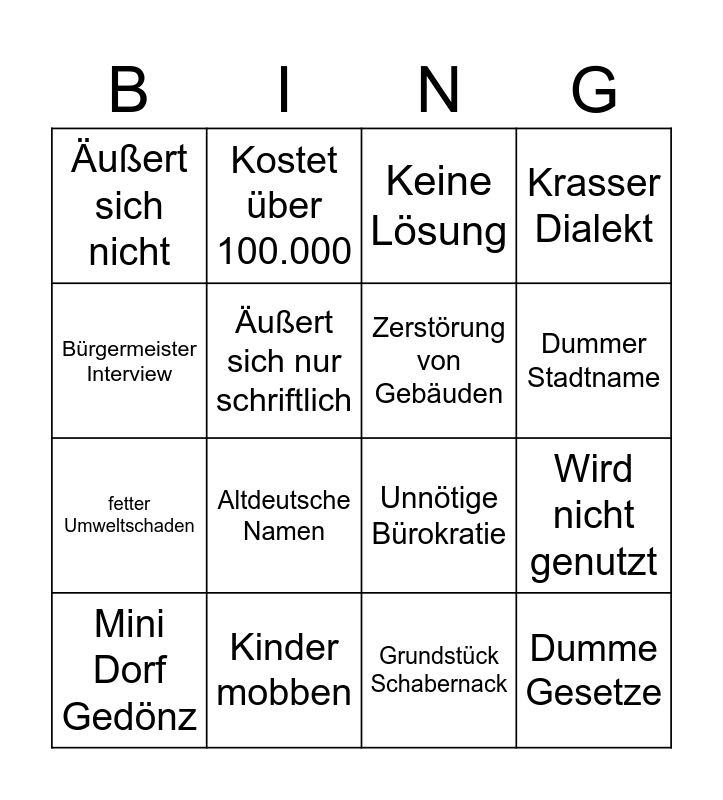 This bingo card has 26 words: Rentner mobben, Dummer Name, Dummer Stadtname, Schlechte Ausrede, Bürgermeister Interview, Äußert sich nicht, Äußert sich nur schriftlich, Kostet über 100.000, Grundstück Schabernack, Dumme Bauten, fetter Umweltschaden, Unnötige Bürokratie, Straßenverkehr Dummheit, Politiker entscheiden Bullshit, Wird nicht genutzt, Öffis scheißen rein, Krasser Dialekt, Dumme Gesetze, Keine Lösung, Mini Dorf Gedönz, Altdeutsche Namen, Belastung für Anwohner, Kinder mobben, Lange Bauzeit, Zerstörung von Gebäuden and Alman.
