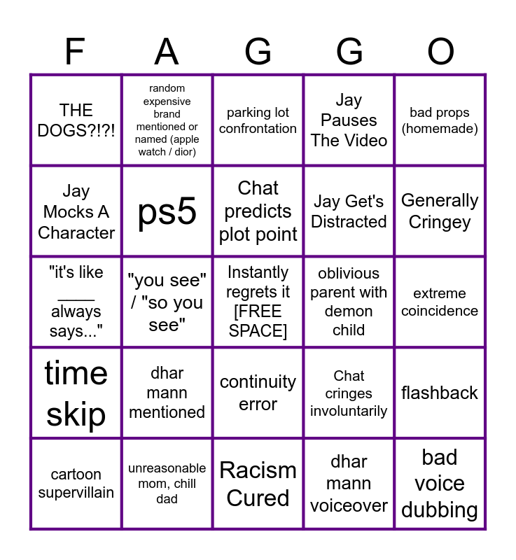 This bingo card has a free space and 32 words: dhar mann voiceover, dhar car, "you see" / "so you see", merch in video, time skip, ps5, bad props (homemade), flashback, random expensive brand mentioned or named (apple watch / dior), dhar mann studios office in the video, Chat predicts plot point, parking lot confrontation, spaghetti, creep behavior, oblivious parent with demon child, kids with ipad, cartoon supervillain, "it's like ____ always says...", continuity error, dhar mann mentioned, Chat cringes involuntarily, someone fired over something small, extreme coincidence, unreasonable mom, chill dad, bad voice dubbing, Jay Pauses The Video, Jay Get's Distracted, Jay Mocks A Character, THE DOGS?!?!, Racism Cured, Roblox Or Fortnite and Generally Cringey.