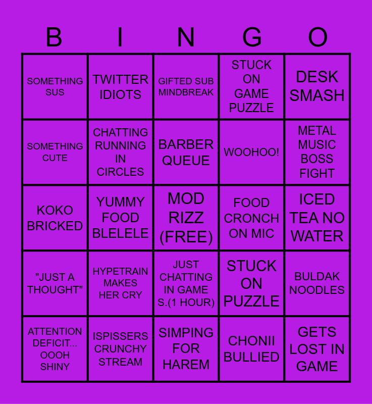 This bingo card has a free space and 24 words: HYPETRAIN MAKES HER CRY, ISPISSERS CRUNCHY STREAM, BARBER QUEUE, ATTENTION DEFICIT... OOOH SHINY, DESK SMASH, SOMETHING SUS, SOMETHING CUTE, TWITTER IDIOTS, FOOD CRONCH ON MIC, JUST CHATTING IN GAME S.(1 HOUR), WOOHOO!, KOKO BRICKED, STUCK ON PUZZLE, BULDAK NOODLES, CHATTING RUNNING IN CIRCLES, CHONII BULLIED, ICED TEA NO WATER, GIFTED SUB MINDBREAK, METAL MUSIC BOSS FIGHT, YUMMY FOOD BLELELE, GETS LOST IN GAME, "JUST A THOUGHT", STUCK ON GAME PUZZLE and SIMPING FOR HAREM.