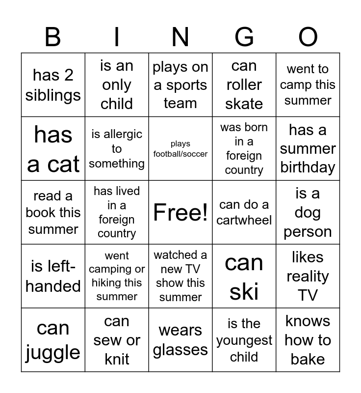 This bingo card has a free space and 29 words: can juggle, loves to read, has lived in a foreign country, has been to the USA, has 2 siblings, plays on a sports team, is allergic to something, went camping or hiking this summer, can do a cartwheel, can sew or knit, is a dog person, knows how to bake, wears glasses, is the youngest child, has a summer birthday, plays a musical instrument, watched a new TV show this summer, is left-handed, went to camp this summer, read a book this summer, can ski, is the eldest child, was born in a foreign country, has a cat, can roller skate, is an only child, likes reality TV, plays football/soccer and performs in theater.