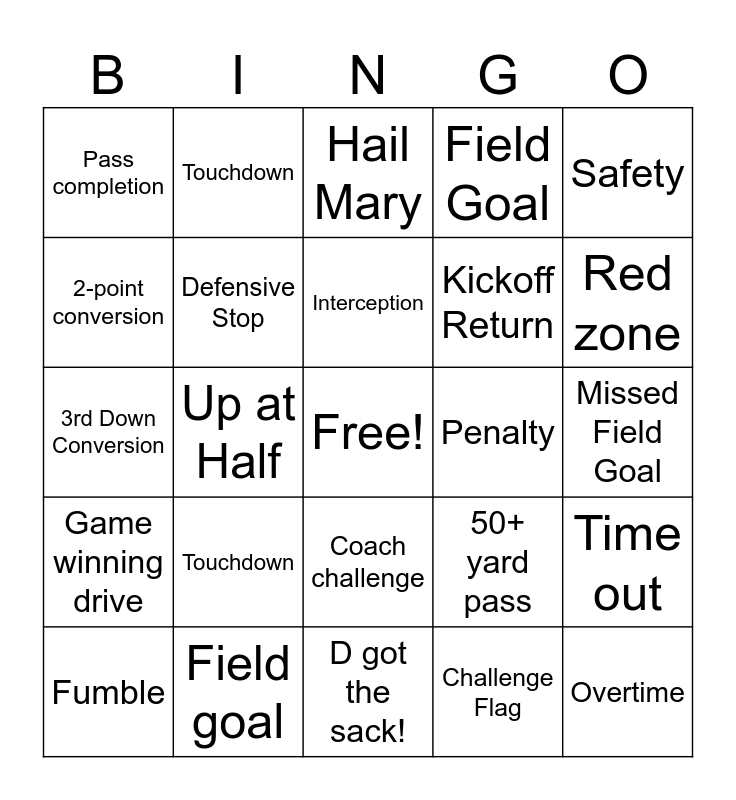 This bingo card has a free space and 24 words: Touchdown, Field goal, Interception, Fumble, Safety, Pass completion, 2-point conversion, Touchdown, Penalty, Coach challenge, Kickoff Return, 3rd Down Conversion, 50+ yard pass, Time out, Defensive Stop, Challenge Flag, Missed Field Goal, Hail Mary, Red zone, Up at Half, Overtime, Game winning drive, Field Goal and D got the sack!.