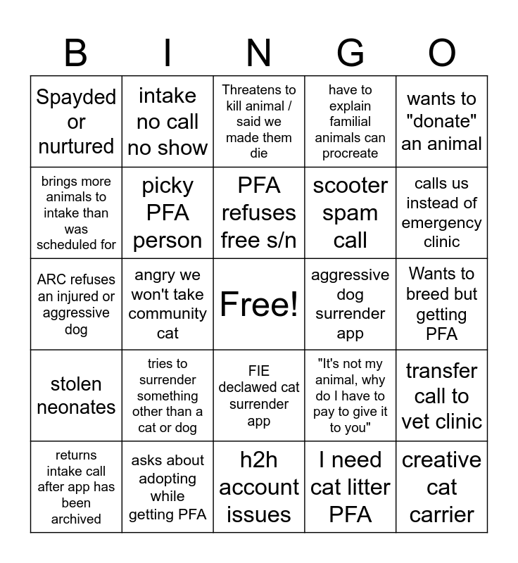 This bingo card has a free space and 24 words: tries to surrender something other than a cat or dog, asks about adopting while getting PFA, PFA refuses free s/n, returns intake call after app has been archived, wants to "donate" an animal, Spayded or nurtured, brings more animals to intake than was scheduled for, intake no call no show, aggressive dog surrender app, FIE declawed cat surrender app, scooter spam call, ARC refuses an injured or aggressive dog, "It's not my animal, why do I have to pay to give it to you", transfer call to vet clinic, picky PFA person, I need cat litter PFA, Wants to breed but getting PFA, Threatens to kill animal / said we made them die, calls us instead of emergency clinic, angry we won't take community cat, creative cat carrier, stolen neonates, have to explain familial animals can procreate and h2h account issues.