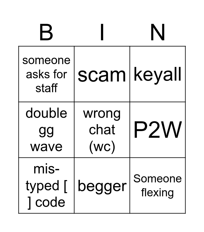This bingo card has 27 words: How to get pets, what to do with skulls/gems/souls, Someone flexing, dumb person in chat, P2W, keyall, scam, cloud cf, clouds to souls /gems purchase, new player joins, old player joins, double gg wave, ether rank talks in chat, how to play, advertisement, spam, mis-typed [ ] code, begger, link in chat, someone asks for staff, chat spam (not cg or gg wave), someone types gg after gg wave, mew/aqua talks, argument lasts over 3 mins, how to craft totems, wrong chat (wc) and mention of time/timezone.