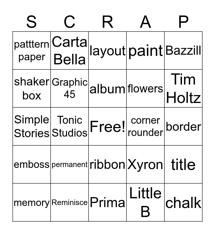 This bingo card has a free space and 24 words: permanent, Reminisce, album, memory, Bazzill, patttern paper, shaker box, Carta Bella, corner rounder, ribbon, flowers, Simple Stories, Xyron, title, Graphic 45, Little B, border, layout, Tim Holtz, Tonic Studios, chalk, emboss, paint and Prima.