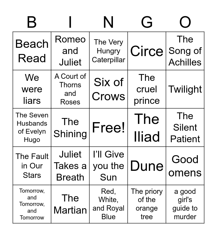 This bingo card has a free space and 33 words: The Hunger Games, Heartstopper, The Shining, Normal People, The Fault in Our Stars, A Court of Thorns and Roses, The Song of Achilles, Tomorrow, and Tomorrow, and Tomorrow, Romeo and Juliet, Fourth Wing, Six of Crows, The Very Hungry Caterpillar, Percy Jackson The Lightning Thief, Ready Player One, The Iliad, Twilight, The Martian, The Seven Husbands of Evelyn Hugo, Juliet Takes a Breath, Dune, I’ll Give you the Sun, Divergent, Beach Read, The Silent Patient, Red, White, and Royal Blue, a good girl's guide to murder, Circe, The cruel prince, We were liars, Good omens, The night circus, The priory of the orange tree and I’m glad my mom died.
