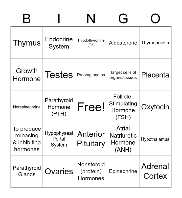 This bingo card has a free space and 25 words: Hypophyseal Portal System, Nonsteroid (protein) Hormones, Prostaglandins, Parathyroid Glands, Thymopoietin, Thymus, Growth Hormone, Endocrine System, Follicle-Stimulating Hormone (FSH), Anterior Pituitary, Target cells of organs/tissues, Norepinephrine, Atrial Natriuretic Hormone (ANH), Hypothalamus, Testes, Pancreatic Islets, Oxytocin, Triiodothyronine (T3), Placenta, Parathyroid Hormone (PTH), Adrenal Cortex, Ovaries, To produce releasing & inhibiting hormones, Aldosterone and Epinephrine.