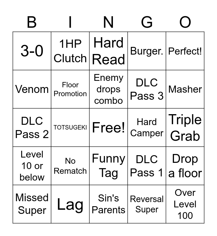This bingo card has a free space and 24 words: No Rematch, Lag, Enemy drops combo, Missed Super, Perfect!, 3-0, Venom, 1HP Clutch, Hard Camper, Funny Tag, DLC Pass 3, DLC Pass 2, DLC Pass 1, Drop a floor, Floor Promotion, Reversal Super, Triple Grab, Hard Read, Masher, TOTSUGEKI, Over Level 100, Level 10 or below, Burger. and Sin's Parents.