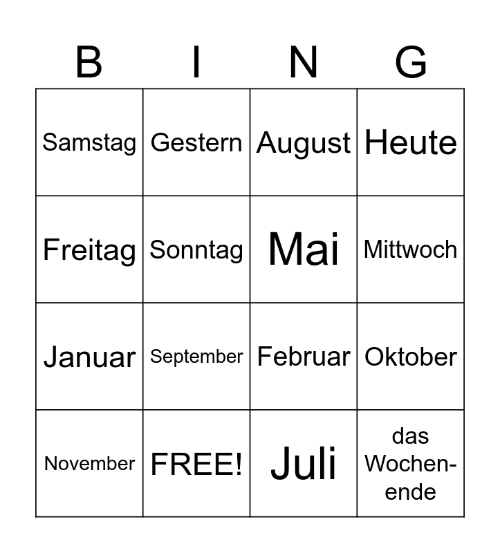 This bingo card has 25 words: Montag, Dienstag, Mittwoch, Donnerstag, Freitag, Samstag, Sonntag, Gestern, FREE!, Morgen, Januar, Februar, Maerz, April, Mai, Juni, Juli, August, September, Oktober, November, Dezember, das Wochen- ende, Heute and das Jahr.