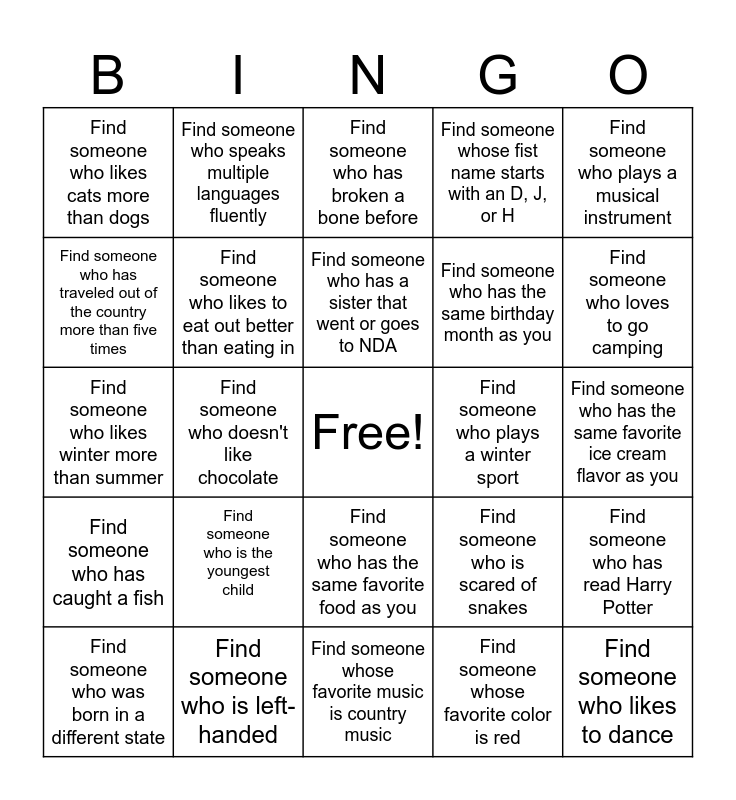 This bingo card has a free space and 24 words: Find someone who is the youngest child, Find someone who is left-handed, Find someone who has a sister that went or goes to NDA, Find someone who was born in a different state, Find someone who plays a musical instrument, Find someone who likes cats more than dogs, Find someone who has traveled out of the country more than five times, Find someone who speaks multiple languages fluently, Find someone who plays a winter sport, Find someone who has the same favorite food as you, Find someone who has the same birthday month as you, Find someone who likes winter more than summer, Find someone who is scared of snakes, Find someone who has read Harry Potter, Find someone who likes to eat out better than eating in, Find someone whose favorite color is red, Find someone who has the same favorite ice cream flavor as you, Find someone who has broken a bone before, Find someone who loves to go camping, Find someone who doesn't like chocolate, Find someone who likes to dance, Find someone who has caught a fish, Find someone whose fist name starts with an D, J, or H and Find someone whose favorite music is country music.