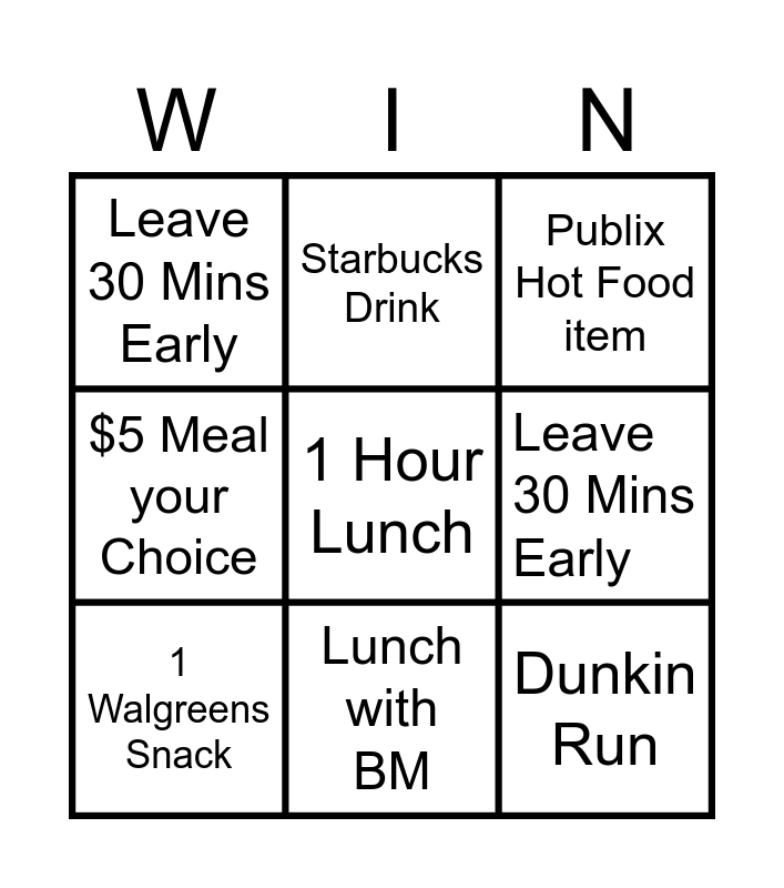 This bingo card has a free space and 8 words: Leave 30 Mins Early, Publix Hot Food item, Starbucks Drink, 1 Walgreens Snack, Leave 30 Mins Early, Dunkin Run, $5 Meal your Choice and Lunch with BM.