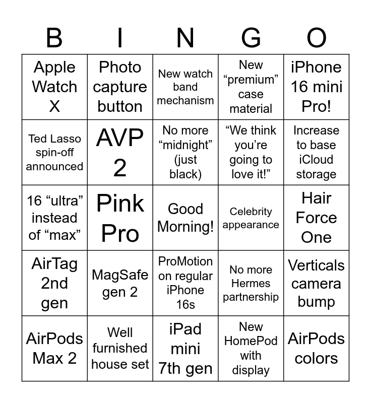 This bingo card has a free space and 29 words: AirPods Max 2, AirPods 4, Pink Pro, iPhone SE 4, Apple Watch X, New watch band mechanism, AVP 2, MagSafe gen 2, Celebrity appearance, Well furnished house set, Hair Force One, AirPods colors, iPad mini 7th gen, New HomePod with display, Increase to base iCloud storage, iPad 11th gen, ProMotion on regular iPhone 16s, AirTag 2nd gen, iPhone 16 mini Pro!, 16 “ultra” instead of “max”, No more Hermes partnership, 09/20 launch date, “We think you’re going to love it!”, Ted Lasso spin-off announced, New “premium” case material, Photo capture button, Verticals camera bump, No more “midnight” (just black) and Gold/Brown 16 Pro.