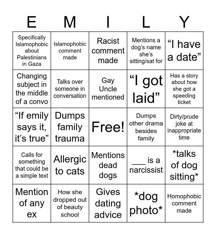 This bingo card has a free space and 24 words: Allergic to cats, How she dropped out of beauty school, Gay Uncle mentioned, Mention of any ex, “I have a date”, Specifically Islamophobic about Palestinians in Gaza, Changing subject in the middle of a convo, Islamophobic comment made, Dumps other drama besides family, Mentions dead dogs, “I got laid”, “If emily says it, it’s true”, ___ is a narcissist, *talks of dog sitting*, Talks over someone in conversation, *dog photo*, Dirty/prude joke at inappropriate time, Racist comment made, Has a story about how she got a speeding ticket, Dumps family trauma, Homophobic comment made, Calls for something that could be a simple text, Mentions a dog’s name she’s sitting/sat for and Gives dating advice.