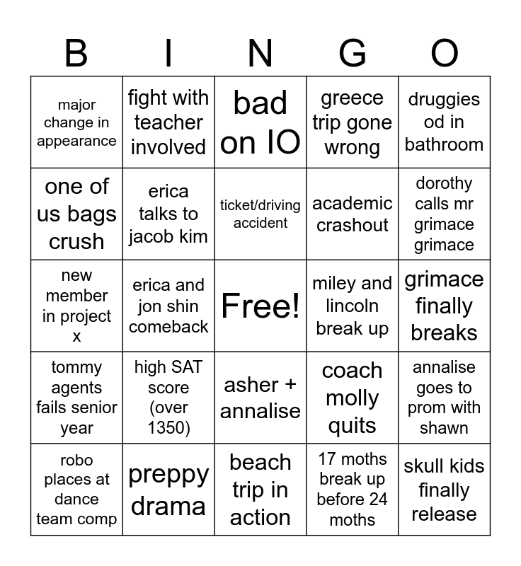 This bingo card has a free space and 24 words: high SAT score (over 1350), preppy drama, ticket/driving accident, robo places at dance team comp, druggies od in bathroom, major change in appearance, one of us bags crush, fight with teacher involved, miley and lincoln break up, asher + annalise, academic crashout, new member in project x, coach molly quits, annalise goes to prom with shawn, erica talks to jacob kim, 17 moths break up before 24 moths, grimace finally breaks, bad on IO, dorothy calls mr grimace grimace, erica and jon shin comeback, skull kids finally release, tommy agents fails senior year, greece trip gone wrong and beach trip in action.
