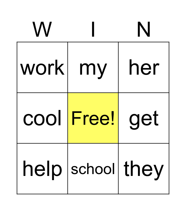 This bingo card has a free space and 8 words: get, her, my, help, work, they, cool and school.
