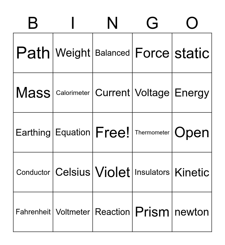 This bingo card has a free space and 75 words: Medium, Boiling, Balanced, Kelvin, Parallel, Dispersion, Day, Ammeter, Joule, Potential, Action, Height, Current, Mass, Colors, Equation, Heat, newton, Light, static, Solid, Earthing, Calorimeter, Weight, Force, Battery, Volts, Friction, Breaker, Liquid, Load, Switch, Closed, Insulators, Energy, Voltage, Sound, Diffraction, Open, Prism, Unbalanced, Resistance, Positive, Fuse, Net, Interaction, Fahrenheit, Path, wires, Negative, temperature, Violet, Electricity, Wavelength, Red, terminal, Rainbow, Tension, Charges, Ohm, Celsius, Night, Inertia, Gas, Acceleration, Thermometer, Frequency, Gravity, Normal, Kinetic, Conductor, Voltmeter, Series, Reaction and Circuit.