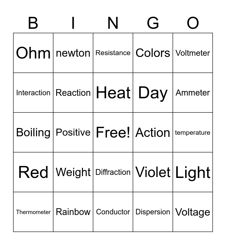 This bingo card has a free space and 75 words: Solid, Medium, Resistance, Friction, Breaker, Current, Charges, Acceleration, Sound, Unbalanced, Potential, Parallel, Heat, Interaction, Switch, Positive, Night, Voltage, Calorimeter, Voltmeter, Tension, Boiling, Reaction, newton, Colors, Kinetic, Normal, Fahrenheit, Energy, Electricity, Inertia, Circuit, Load, Violet, Ammeter, Day, Prism, Gas, temperature, Dispersion, Mass, terminal, wires, Frequency, Series, Height, Thermometer, Ohm, Battery, Joule, Wavelength, Diffraction, Path, Open, Earthing, Kelvin, Net, Gravity, Force, Insulators, Weight, Equation, Closed, Liquid, Balanced, Action, Volts, Fuse, Celsius, Light, Red, Rainbow, Negative, Conductor and static.
