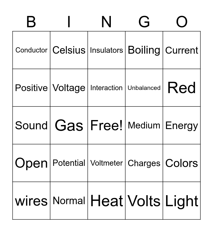 This bingo card has a free space and 75 words: Liquid, Path, Insulators, Mass, static, Frequency, Equation, Breaker, Kinetic, Gravity, Height, Ohm, Interaction, Positive, Negative, Gas, Tension, Light, Switch, Current, Violet, Sound, Voltage, Celsius, Boiling, Balanced, terminal, Kelvin, Fahrenheit, Load, Wavelength, Friction, Inertia, Charges, Red, Unbalanced, Prism, Net, Energy, Volts, Dispersion, Series, Night, Calorimeter, Acceleration, Action, wires, Conductor, Resistance, Diffraction, Fuse, Voltmeter, Earthing, Rainbow, Solid, Battery, Weight, Electricity, Circuit, Thermometer, Potential, Closed, Force, temperature, Joule, Medium, Reaction, Parallel, newton, Colors, Open, Normal, Day, Heat and Ammeter.
