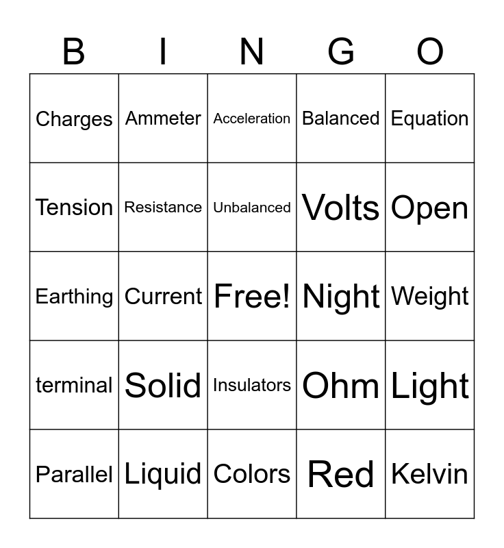 This bingo card has a free space and 75 words: Gas, Load, Acceleration, Dispersion, newton, Inertia, Interaction, Friction, Positive, Energy, Height, wires, Unbalanced, Tension, Fahrenheit, Current, static, Kelvin, Calorimeter, Equation, Closed, Earthing, Resistance, Ammeter, Balanced, Frequency, Heat, Wavelength, Battery, Violet, Thermometer, Net, Sound, Ohm, Open, Volts, Boiling, Action, Weight, Red, Path, Joule, Potential, Medium, Electricity, Negative, Parallel, Charges, temperature, Reaction, Circuit, Insulators, Prism, Switch, Breaker, Gravity, Voltmeter, Conductor, Fuse, Voltage, Solid, Kinetic, Celsius, Force, Mass, Night, Diffraction, Rainbow, Day, Light, terminal, Liquid, Series, Colors and Normal.