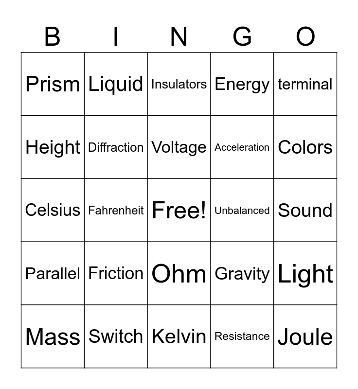 This bingo card has a free space and 75 words: Medium, Series, Insulators, Boiling, temperature, Balanced, Gas, Breaker, Day, Battery, Voltmeter, Volts, Voltage, Height, Reaction, Fahrenheit, newton, Joule, Fuse, terminal, Frequency, Celsius, Diffraction, Liquid, Energy, Conductor, Positive, Current, Heat, Electricity, Load, Wavelength, Tension, Gravity, Colors, Acceleration, wires, static, Sound, Resistance, Normal, Ammeter, Red, Thermometer, Night, Closed, Mass, Prism, Action, Force, Charges, Ohm, Circuit, Path, Rainbow, Open, Earthing, Calorimeter, Negative, Dispersion, Friction, Solid, Kinetic, Weight, Equation, Unbalanced, Violet, Interaction, Net, Light, Parallel, Switch, Potential, Kelvin and Inertia.