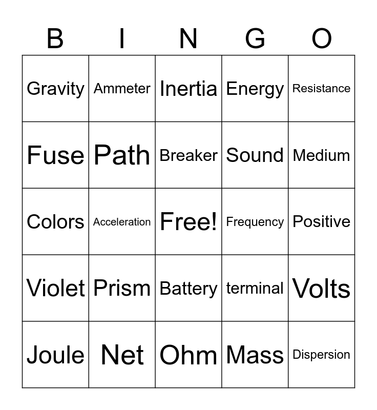 This bingo card has a free space and 75 words: Gas, Height, Inertia, Open, Day, Kelvin, Balanced, Parallel, Switch, Fahrenheit, Weight, Thermometer, Breaker, Fuse, Insulators, Acceleration, Series, Dispersion, Earthing, Resistance, Closed, Colors, Path, Ammeter, Energy, Celsius, Liquid, temperature, Normal, Solid, Tension, Boiling, Diffraction, terminal, Medium, Sound, Potential, static, Positive, Mass, Night, Equation, Action, Conductor, Electricity, newton, Joule, Gravity, Heat, Unbalanced, Red, Battery, Kinetic, Interaction, Negative, Force, Load, Circuit, Current, Light, Prism, Friction, Reaction, Voltmeter, Calorimeter, Frequency, Charges, Voltage, Rainbow, Volts, Violet, Net, Wavelength, Ohm and wires.