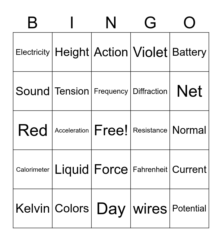 This bingo card has a free space and 75 words: Friction, Solid, Action, newton, Negative, temperature, Gas, Volts, Earthing, Joule, Ohm, Prism, Frequency, Sound, Closed, Acceleration, Dispersion, Potential, Wavelength, Battery, Thermometer, Red, Tension, Height, Violet, Voltage, Open, Load, Heat, Charges, Insulators, Ammeter, Unbalanced, Fahrenheit, Net, Diffraction, Breaker, Interaction, Normal, wires, Boiling, static, Kinetic, Mass, Energy, Equation, Kelvin, Electricity, terminal, Inertia, Voltmeter, Force, Path, Balanced, Gravity, Switch, Medium, Circuit, Weight, Reaction, Liquid, Conductor, Fuse, Positive, Rainbow, Resistance, Celsius, Night, Light, Current, Calorimeter, Colors, Parallel, Day and Series.