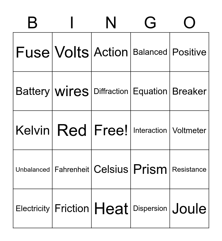 This bingo card has a free space and 75 words: Series, Colors, Action, Sound, Violet, Insulators, Liquid, Path, Weight, terminal, Circuit, Tension, Diffraction, Battery, Conductor, Red, Acceleration, Joule, Light, Positive, Gas, Kelvin, wires, Volts, Balanced, Thermometer, Earthing, Frequency, Voltage, Night, Rainbow, Reaction, static, Prism, Breaker, Equation, Current, Kinetic, Voltmeter, Dispersion, Energy, Ohm, Solid, Potential, Day, Normal, Electricity, Fuse, Force, Inertia, Boiling, Celsius, Negative, Medium, Open, Wavelength, Load, Charges, Switch, Gravity, Fahrenheit, Net, Closed, Height, newton, Interaction, Calorimeter, Ammeter, Parallel, Resistance, Unbalanced, Friction, temperature, Heat and Mass.