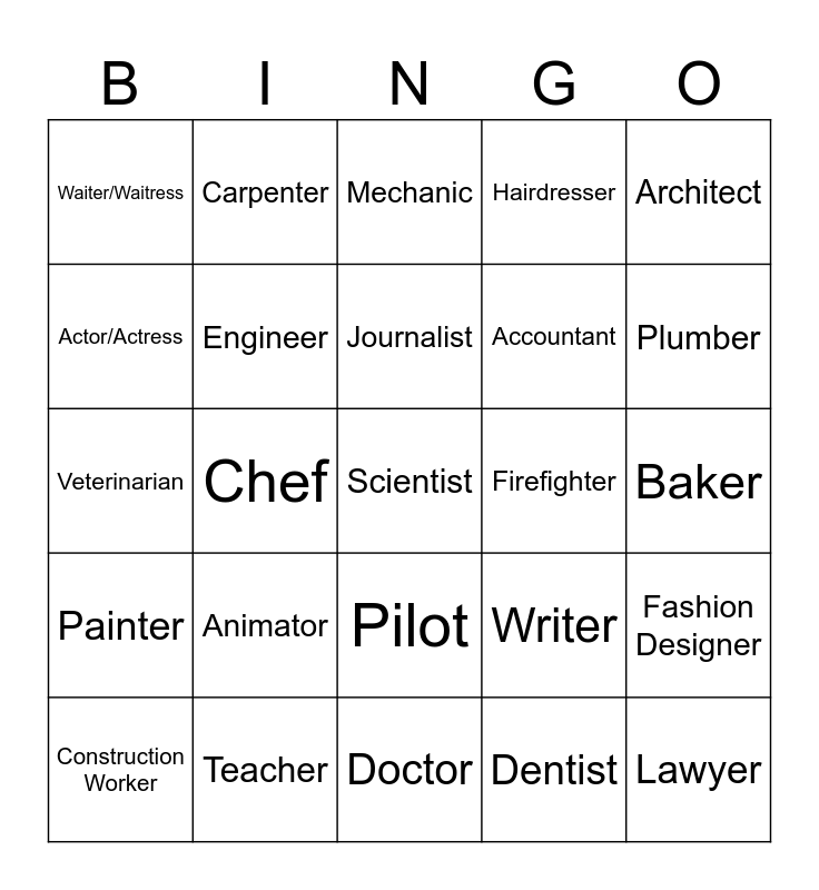 This bingo card has 30 words: Teacher, Musician, Chef, Nurse, Waiter/Waitress, Mechanic, Engineer, Pilot, Firefighter, Doctor, Baker, Scientist, Dentist, Lawyer, Plumber, Therapist, Writer, Painter, Animator, Architect, Veterinarian, Police Officer, Carpenter, Accountant, Actor/Actress, Hairdresser, Fashion Designer, Construction Worker, Journalist and Model.