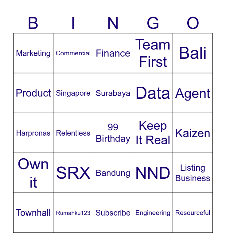 This bingo card has a free space and 40 words: 99Group, Harpronas, Indonesia, Singapore, Rumahku123, Bandung, Surabaya, Medan, Bali, Own it, Relentless, Team First, Resourceful, Kaizen, Keep It Real, SRX, People, Marketing, Developer Sales, Finance, Listing Business, Engineering, Data, Product, Bank & Media, CEO Team, Property, Marketplace, Propvaganza, Kokas, Darius, Townhall, WMI, NND, Agent, Subscribe, Teras123, Iklan, Commercial and Wasudewan.
