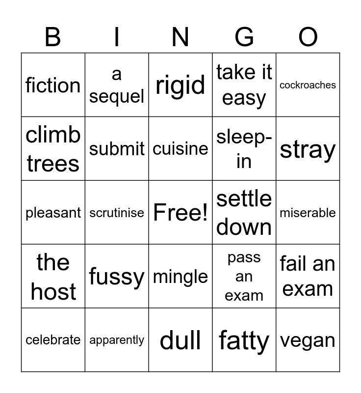 This bingo card has a free space and 24 words: celebrate, fussy, cuisine, fatty, cockroaches, fiction, a sequel, rigid, settle down, miserable, pleasant, submit, pass an exam, fail an exam, climb trees, apparently, dull, take it easy, stray, the host, scrutinise, mingle, sleep-in and vegan.