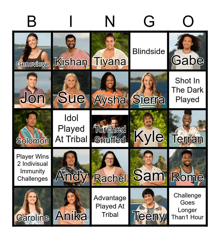 This bingo card has 18 images, a free space and 24 words: Andy, Anika, Aysha, Caroline, Gabe, Genevieve, Jon, Kishan, Kyle, Rachel, Sierra, Solomon, Sam, Rome, Sue, Teeny, Terran, Tiyana, Shot In The Dark Played, Idol Played At Tribal, Challenge Goes Longer Than1 Hour, Player Wins 2 Indivisual Immunity Challenges, Blindside and Advantage Played At Tribal.