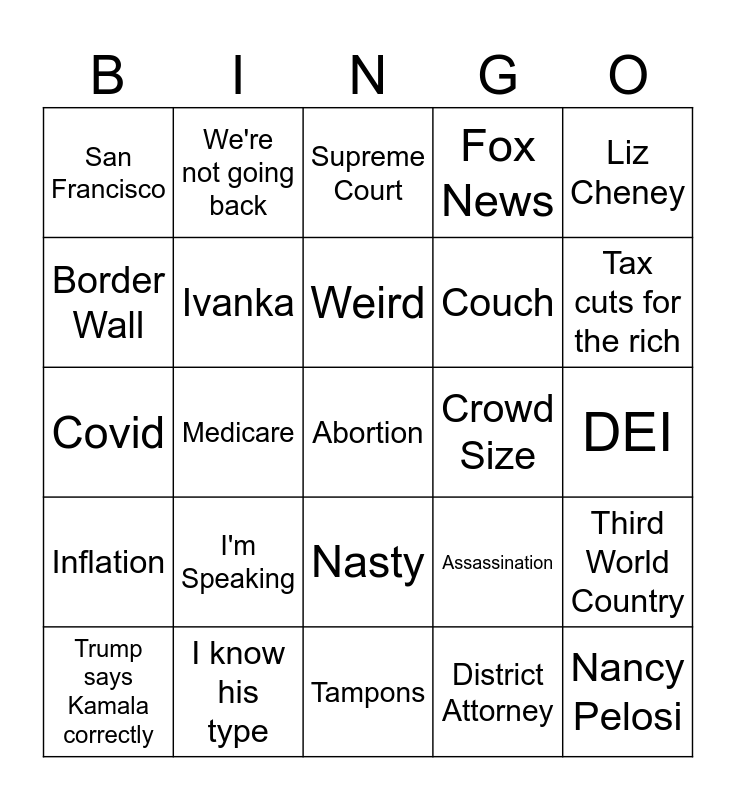 This bingo card has a free space and 24 words: I'm Speaking, I know his type, Weird, Trump says Kamala correctly, Liz Cheney, San Francisco, Border Wall, We're not going back, Crowd Size, Nasty, Couch, Covid, Assassination, Third World Country, Ivanka, District Attorney, DEI, Supreme Court, Tax cuts for the rich, Medicare, Nancy Pelosi, Inflation, Fox News and Tampons.