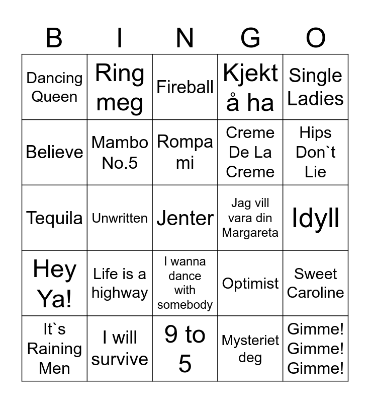 This bingo card has 25 words: Life is a highway, 9 to 5, Rompa mi, It`s Raining Men, Single Ladies, Dancing Queen, Believe, Ring meg, Jag vill vara din Margareta, I wanna dance with somebody, Creme De La Creme, Tequila, Optimist, Sweet Caroline, Mambo No.5, Gimme! Gimme! Gimme!, Idyll, Fireball, Hips Don`t Lie, Unwritten, Jenter, I will survive, Hey Ya!, Kjekt å ha and Mysteriet deg.