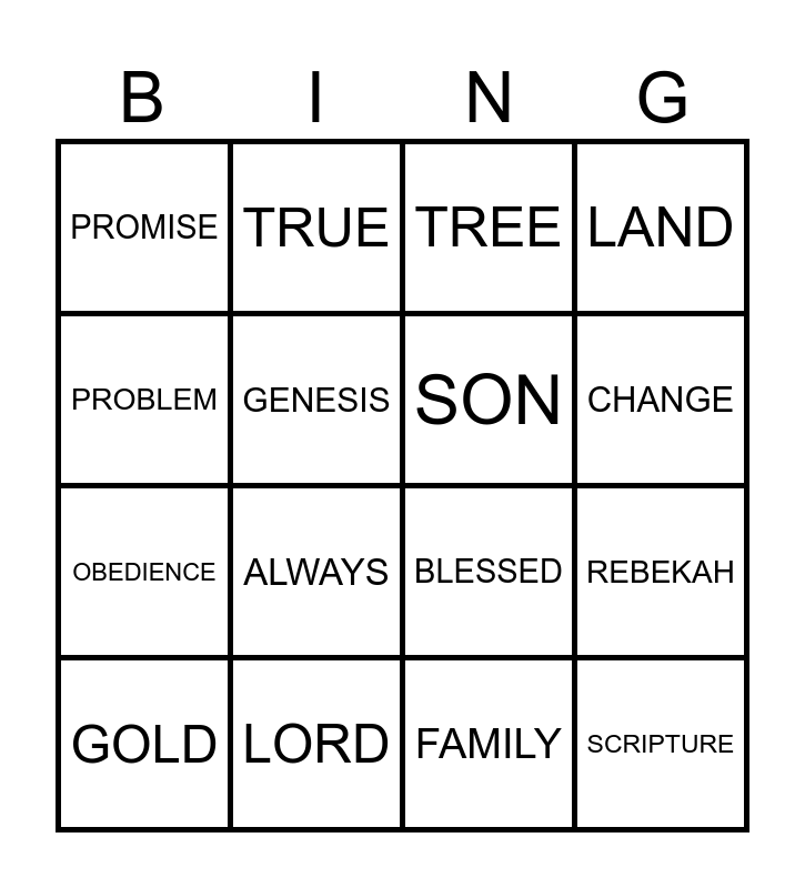 This bingo card has 25 words: FAVOURITE, GOD, CHANGE, PRAYER, PROBLEM, PROMISE, GENESIS, TRUE, LORD, BIBLE, OBEDIENCE, BLESSED, ISAAC, MISSON, SON, SORRY, FAMILY, TREE, ALWAYS, REBEKAH, GOLD, BIBLE, SCRIPTURE, LAND and WATER.
