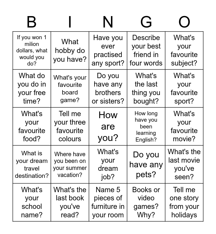 This bingo card has a free space and 24 words: Where have you been on your summer vacation?, What's the last book you've read?, Do you have any brothers or sisters?, What's your school name?, What's your favourite subject?, If you won 1 milion dollars, what would you do?, What do you do in your free time?, What hobby do you have?, How long have you been learning English?, What's your dream job?, What's the last thing you bought?, What's your favourite food?, Do you have any pets?, What's the last movie you've seen?, What's your favourite board game?, Books or video games? Why?, What's your favourite movie?, Have you ever practised any sport?, What's your favourite sport?, Tell me your three favourite colours, Tell me one story from your holidays, What is your dream travel destination?, Describe your best friend in four words and Name 5 pieces of furniture in your room.