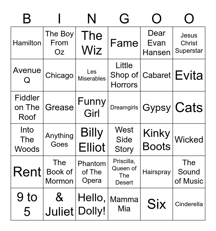 This bingo card has 39 words: & Juliet, 9 to 5, Annie, Avenue Q, Billy Elliot, Cats, Chicago, Cinderella, Dear Evan Hansen, Dreamgirls, Evita, Fame, Fiddler on The Roof, Funny Girl, Grease, Gypsy, Hairspray, Hamilton, Hello, Dolly!, Into The Woods, Jesus Christ Superstar, Kinky Boots, Les Miserables, Little Shop of Horrors, Mamma Mia, Phantom of The Opera, Rent, Six, The Book of Mormon, The Boy From Oz, The Rocky Horror Picture Show, The Sound of Music, The Wiz, West Side Story, Wicked, Priscilla, Queen of The Desert, Anything Goes, Cabaret and La Cage aux Follies.