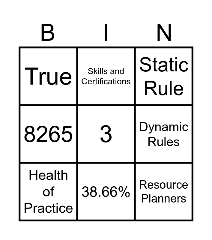 This bingo card has a free space and 14 words: Ready to Staff, 48 hours, Health of Practice, Skills and Certifications, 8265, Resource Planners, 8, Consultant Already Selected, 38.66%, True, Hierarchy, Dynamic Rules, Static Rule and 564.