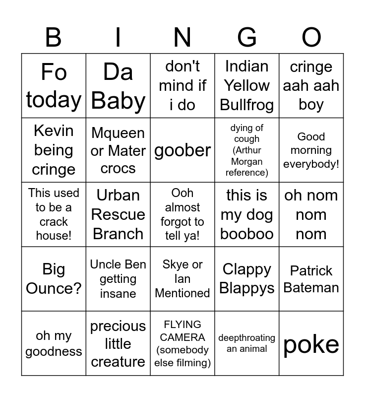 This bingo card has a free space and 27 words: Clappy Blappys, throwing garbanzo bean, dying of cough (Arthur Morgan reference), FLYING CAMERA (somebody else filming), Kevin being cringe, don't mind if i do, Da Baby, Big Ounce?, this is my dog booboo, Patrick Bateman, This used to be a crack house!, Indian Yellow Bullfrog, oh my goodness, precious little creature, Good morning everybody!, based t-shirt, Mqueen or Mater crocs, goober, Uncle Ben getting insane, Fo today, oh nom nom nom, deepthroating an animal, Urban Rescue Branch, poke, Skye or Ian Mentioned, cringe aah aah boy and look at this you guys.
