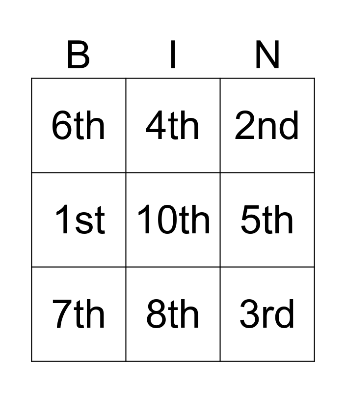 This bingo card has 10 words: 8th, 2nd, 6th, 10th, 1st, 7th, 4th, 9th, 5th and 3rd.