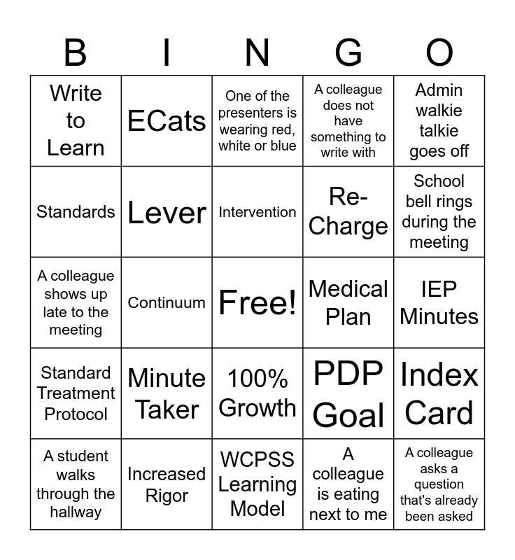 This bingo card has a free space and 24 words: Minute Taker, Increased Rigor, Intervention, A student walks through the hallway, Admin walkie talkie goes off, Write to Learn, Standards, ECats, Medical Plan, 100% Growth, Re-Charge, A colleague shows up late to the meeting, PDP Goal, Index Card, Lever, A colleague is eating next to me, IEP Minutes, One of the presenters is wearing red, white or blue, School bell rings during the meeting, Continuum, A colleague asks a question that's already been asked, Standard Treatment Protocol, A colleague does not have something to write with and WCPSS Learning Model.