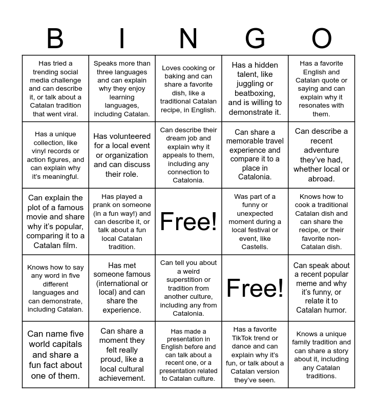 This bingo card has a free space and 25 words: Has met someone famous (international or local) and can share the experience., Has made a presentation in English before and can talk about a recent one, or a presentation related to Catalan culture., Can describe their dream job and explain why it appeals to them, including any connection to Catalonia., Can name five world capitals and share a fun fact about one of them., Has a favorite English and Catalan quote or saying and can explain why it resonates with them., Has tried a trending social media challenge and can describe it, or talk about a Catalan tradition that went viral., Has a unique collection, like vinyl records or action figures, and can explain why it’s meaningful., Speaks more than three languages and can explain why they enjoy learning languages, including Catalan., Was part of a funny or unexpected moment during a local festival or event, like Castells., Can tell you about a weird superstition or tradition from another culture, including any from Catalonia., Can share a memorable travel experience and compare it to a place in Catalonia., Can explain the plot of a famous movie and share why it’s popular, comparing it to a Catalan film., Free!, Can speak about a recent popular meme and why it’s funny, or relate it to Catalan humor., Has volunteered for a local event or organization and can discuss their role., Knows an interesting fact about Vilafranca or a fun myth from any English- speaking country., Knows how to cook a traditional Catalan dish and can share the recipe, or their favorite non- Catalan dish., Loves cooking or baking and can share a favorite dish, like a traditional Catalan recipe, in English., Can describe a recent adventure they’ve had, whether local or abroad., Has played a prank on someone (in a fun way!) and can describe it, or talk about a fun local Catalan tradition., Knows a unique family tradition and can share a story about it, including any Catalan traditions., Can share a moment they felt really proud, like a local cultural achievement., Knows how to say any word in five different languages and can demonstrate, including Catalan., Has a hidden talent, like juggling or beatboxing, and is willing to demonstrate it. and Has a favorite TikTok trend or dance and can explain why it’s fun, or talk about a Catalan version they’ve seen..