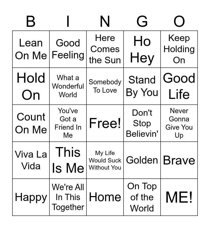 This bingo card has a free space and 29 words: Happy, Humble and Kind, You've Got a Friend In Me, CAN'T STOP THE FEELING!, Lean On Me, Here Comes the Sun, What a Wonderful World, This Is Me, Don't Stop Believin', We're All In This Together, Never Gonna Give You Up, ME!, Home, On Top of the World, Good Life, Wake Me Up, My Life Would Suck Without You, Viva La Vida, Keep Holding On, Count On Me, Golden, Man In The Mirror, Stand By You, Hold On, Ho Hey, Good Feeling, Brave, Somebody To Love and Shake It Off.